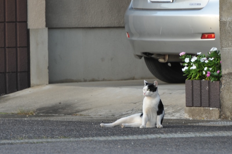 猫(ぬこ)ちゃんがどこかの家の前でくつろいでいます。