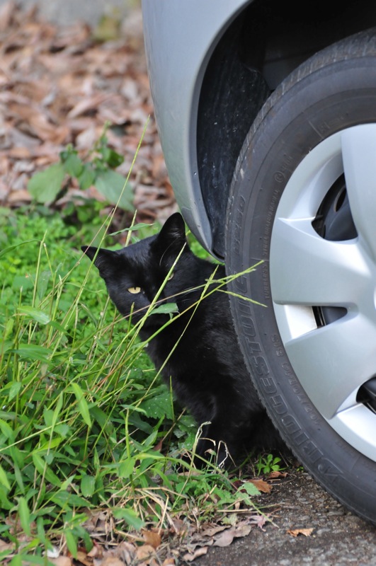 車の後ろから黒猫(ぬこ)ちゃんがこちらを見てます。