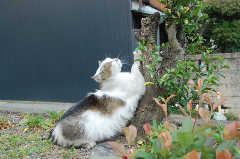 あくびの後は近くにあった木で爪とぎを始めました。
