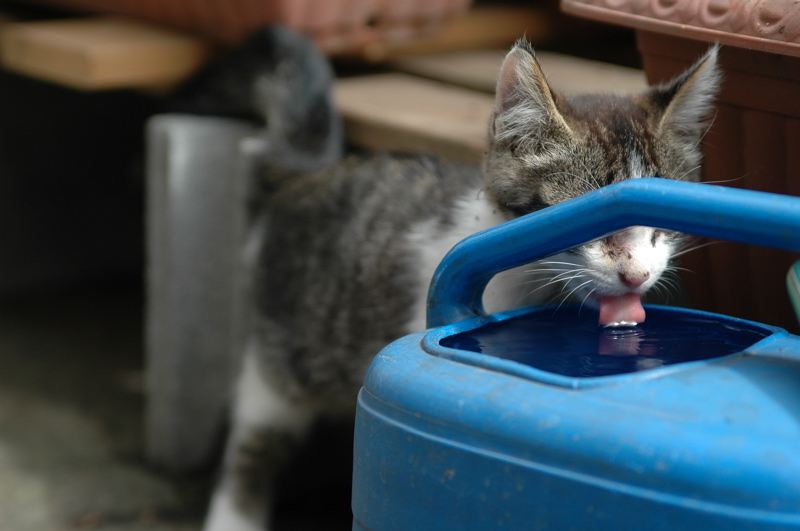 外で喉が乾くとチビはじょうろの水を飲んでいました。