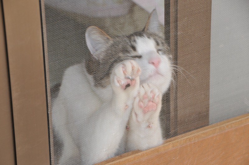 猫(ぬこ)のチビは嬉しいのか網戸にもたれて背伸びをします。