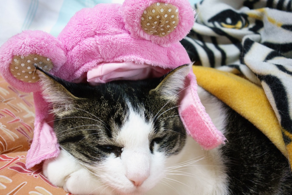 寝ているチビにペット用の帽子を載せてみました。