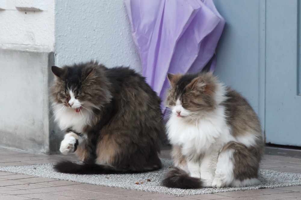 よく似た毛の長いもこもこ猫(ぬこ)ちゃんが2匹で座って