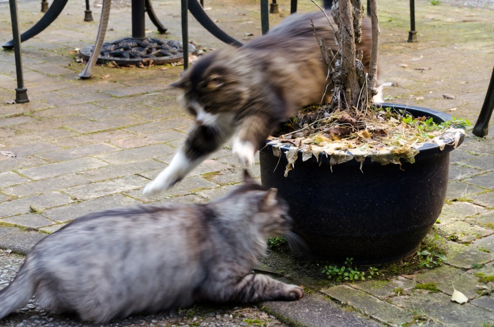 1匹が座っている所に、もう1匹がじゃれて飛びかかる体勢をしていました。