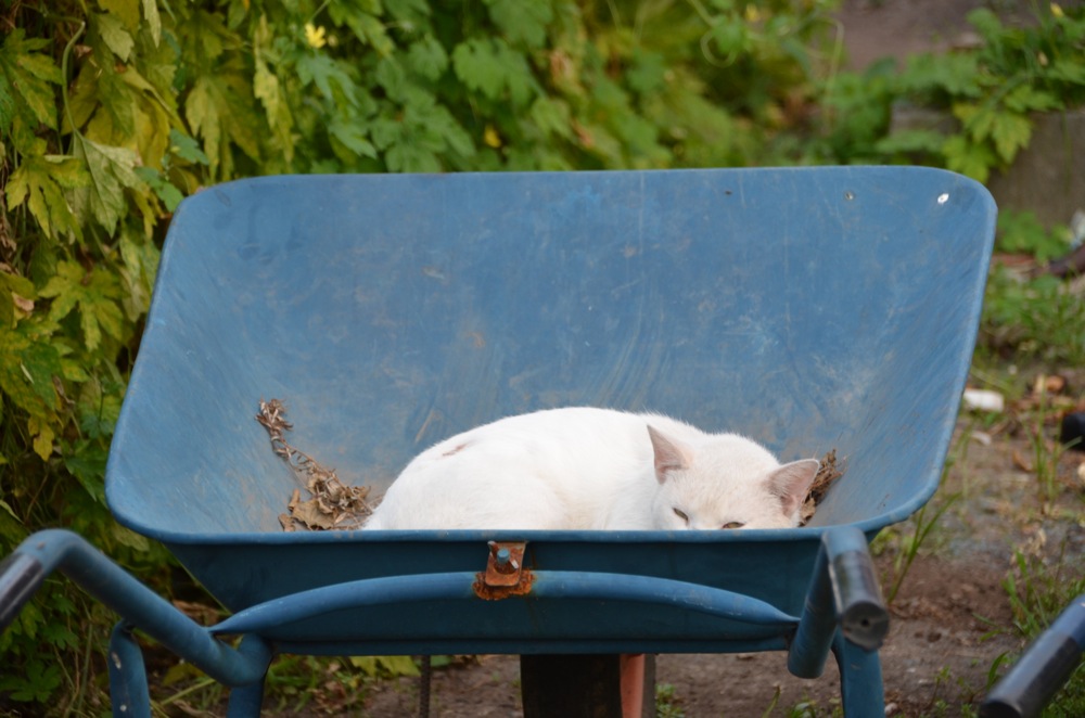 このままリヤカーを押して、白猫を家に連れて帰りたいですね。