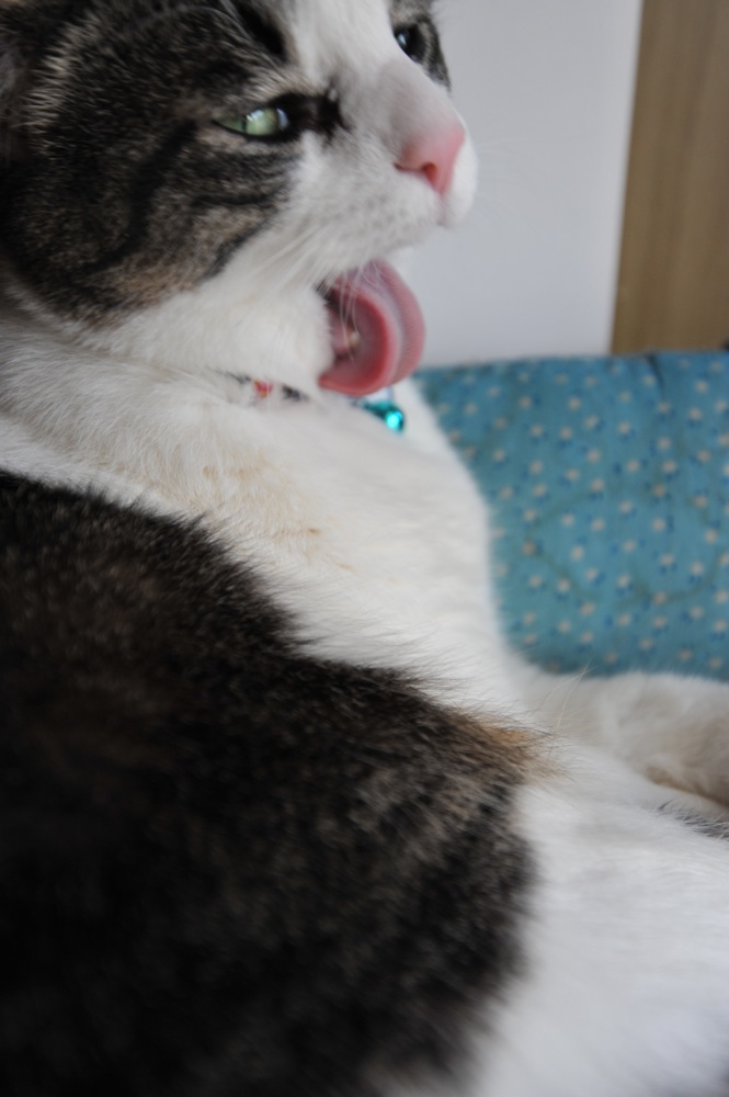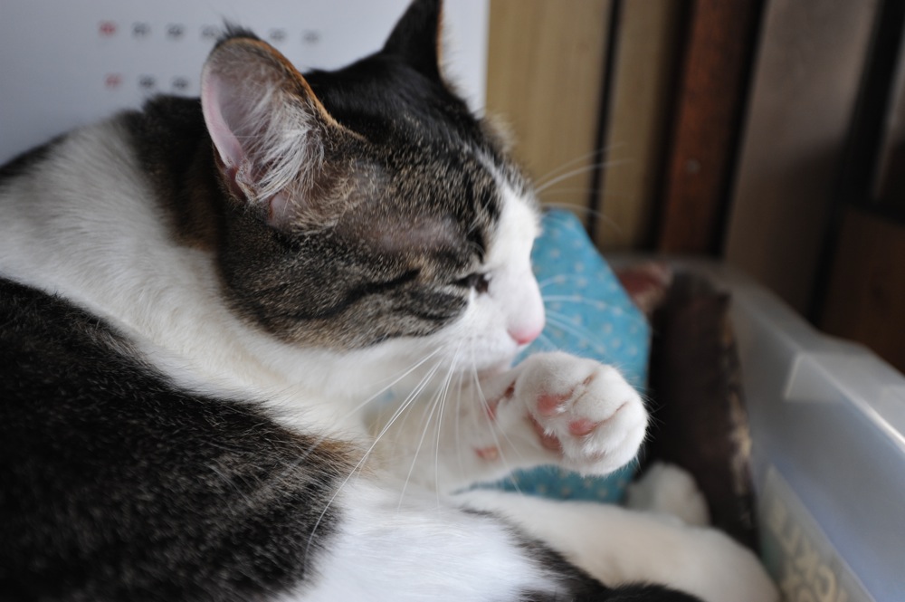 猫(ぬこ)のチビ、自分の手のにおいをかいでいます。