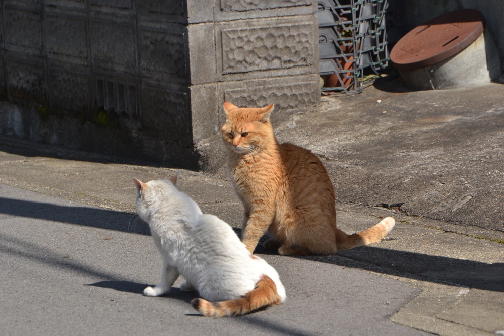 茶猫は知らん顔をして、もう1匹の猫の方をずっとにらんでいます。