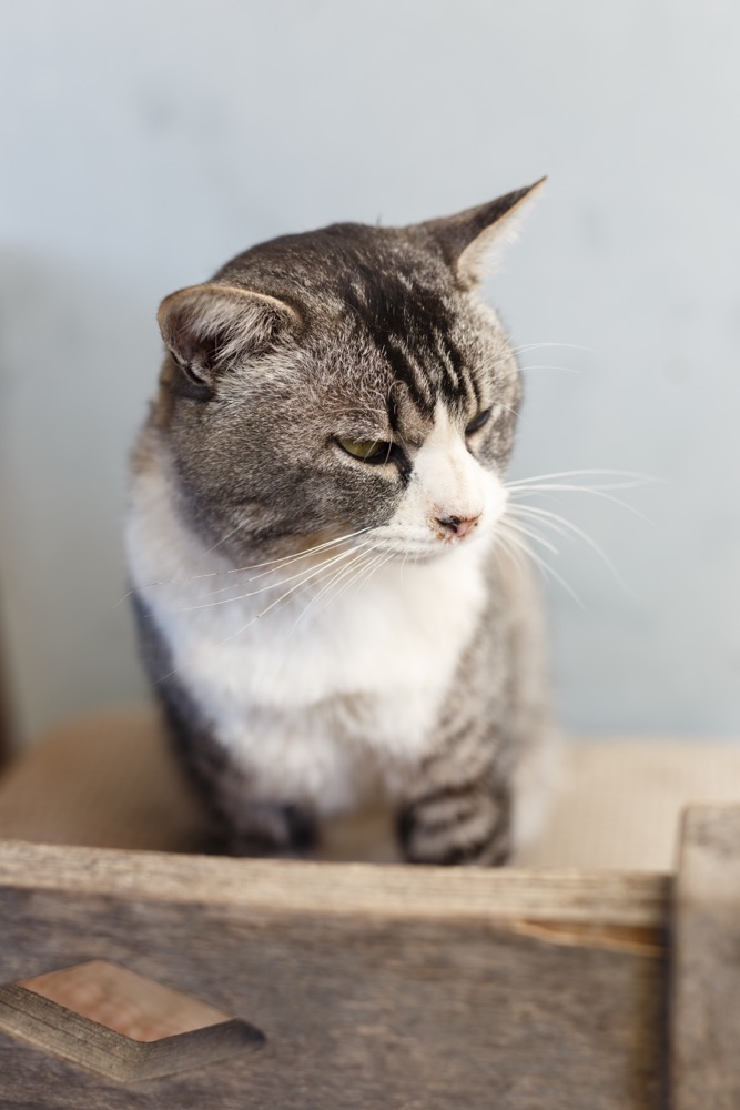 画像は椅子の上に座って、他の猫が来ないか見張ってるサバ猫です。