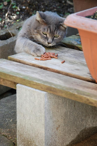 猫パンチをして様子を見ながらキャットフードを食べてます。