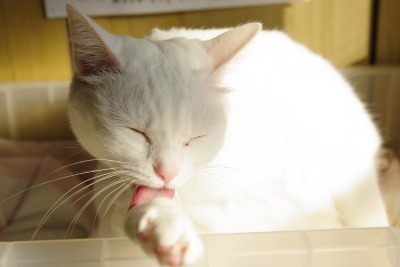 猫(ぬこ)のシロが自分の手を一所懸命舐めてます。
